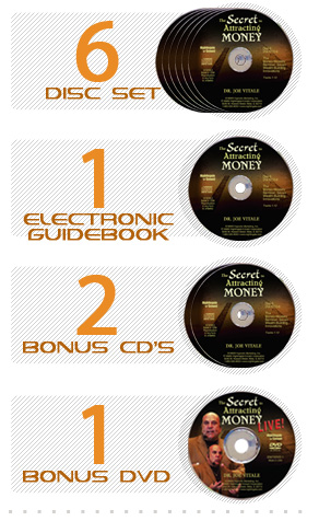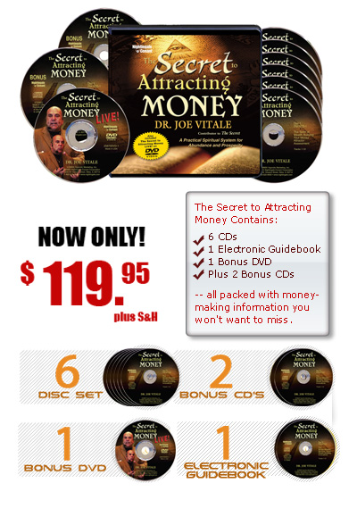 You get all this, the Secret to Attracting Money on six audio CDs, plus the Bonus Gifts consisting of two audio CDs, and one LIVE DVD presentation along with a Surprise Bonus, as yet unrevealed, for the low, low price of only: $119.95! (Plus a nominal S/H charge) – Shipped, straight to your door!
